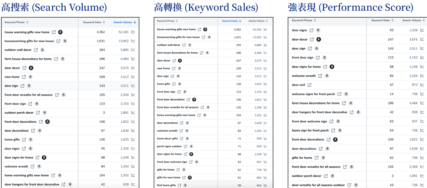 ▲H10 Listing Analyzer -依照搜索量、轉換率、表現由高而低排序,再分類關鍵詞