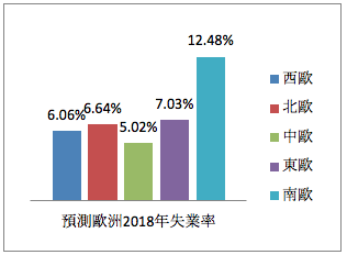 失業率部分,隨著景氣回暖,2016年以來歐洲每個區域的失業率皆逐年下降,預測2018年失業率最低的區域為中歐(5.02%),最高的區域為南歐(12.48%)。