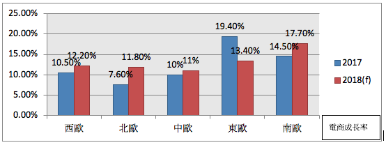 從電子商務比例來看,目前西歐是電商最蓬勃發展的一塊,其次為南歐、北歐、東歐及中歐。但若考慮到人口比例,北歐的消費市場亦值得重視。除此之外,Ecommerce Foundation預測,南歐、東歐區域的電商發展在這兩年(2017~2018)也比其他區域來得迅猛。