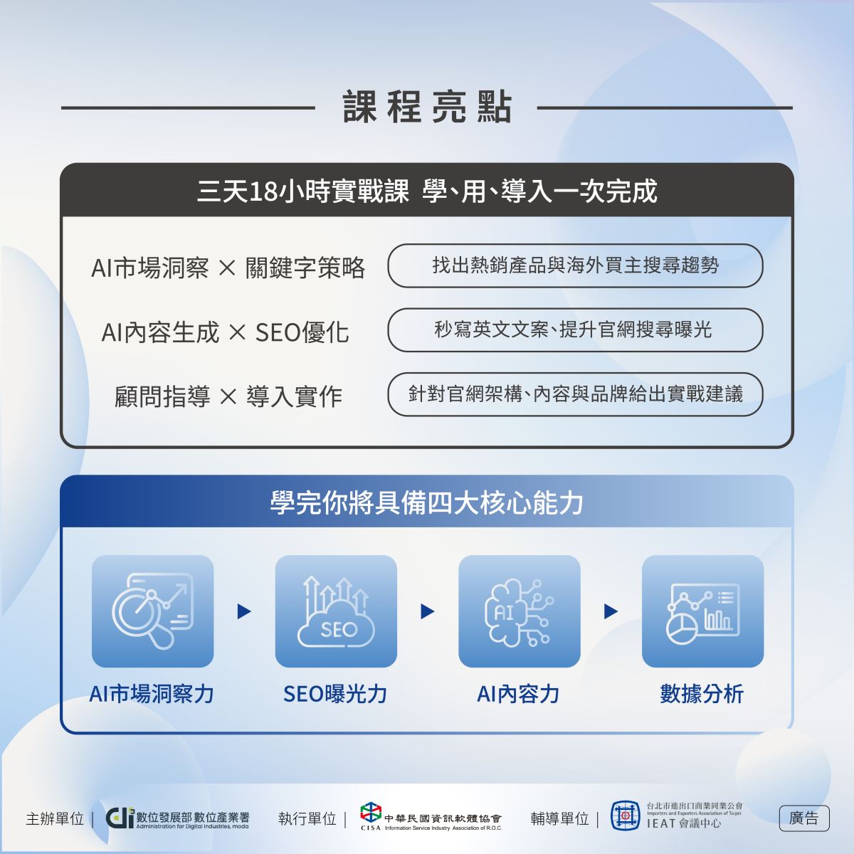 為因應 B2B 外銷企業的全球競爭,本工作坊以「AI 市場洞察 × SEO × 官網優化」為核心,協助企業從被動等待,進化成「買主主動找上門」。課程亮點包括: